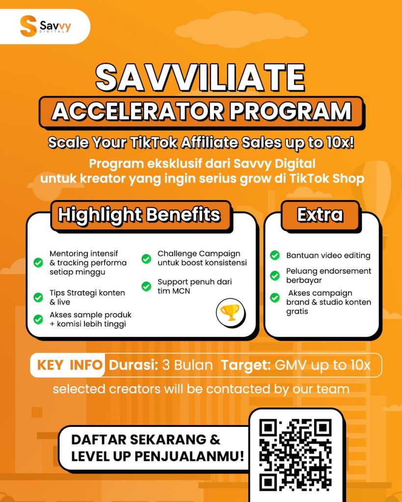 Savviliate Accelerator Program adalah program mentoring dan akselerasi untuk affiliator yang ingin serius scale performa TikTok Affiliate.